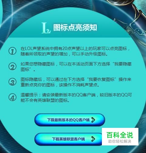 点亮图标条件:你必须是英雄联盟玩家才可以添加,否则不能添加,同时需在LOL声望系统中拥有20点声望以上的玩家可以方点亮图标。(如下图)
