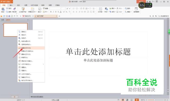 再右键单击左侧列表中的幻灯片,弹出下拉菜单并选择“新建幻灯片”或者直接按回车键,这两种方法都可新建几个幻灯片。