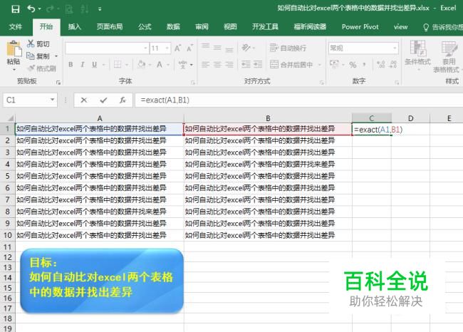 使用EXACT函数,在C列当中照图所示输入公式