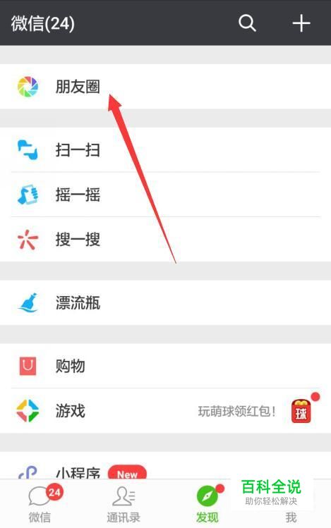 首先我们先打开微信,打开之后进入到“发现”主面板,然后单击面板上的“朋友圈”按钮。