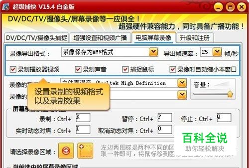 设置视频录制的其他选项 在“录像的音频设备”和“录像的音频端口”处选择正确的选项。 软件默认录制整个电脑屏幕,我们也可以使用“请选择录像区域”栏中的小工具,选择需要录制的视频区域。 在录制过程中,灵活使用快捷键功能,可令录制工作更为简单便捷。超级捕快提供了暂停、开始录制、动态对焦等快捷键操作,不妨在录制前把它们记下来吧!