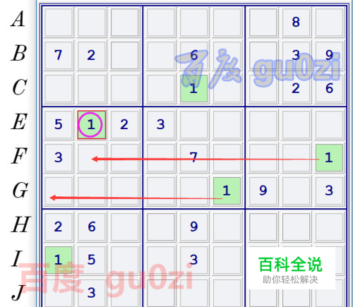 从F9是1,又由于第3宫只剩下左侧和右上角,推出第3宫得到左侧一定存在1,所以得到H8是1,继续可以推出 J4是1,