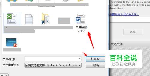 在出现的文件选择对话框中选择一个doc格式的文件,如图所示,然后点击“打开”按钮打开该文件。