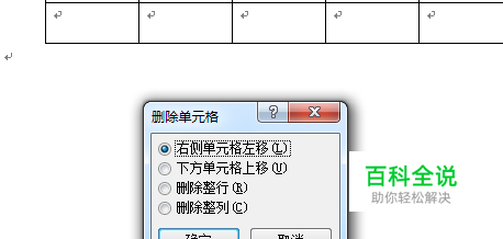 点击后,可选择删除单元格或者行、列的方式。再确定即可。但其中没有删除整个表格的选项。