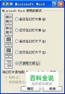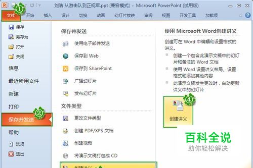 PPT2010版。如图1所示,单击文件——保存并发送——创建讲义——使用MicrosoftWord创建讲义——创建讲义按钮,弹出如图2的"发送到MicrosoftWord"对话框,选择“只使用大纲”,再单击“确定”,即可实现ppt转换成word,如图3所示。