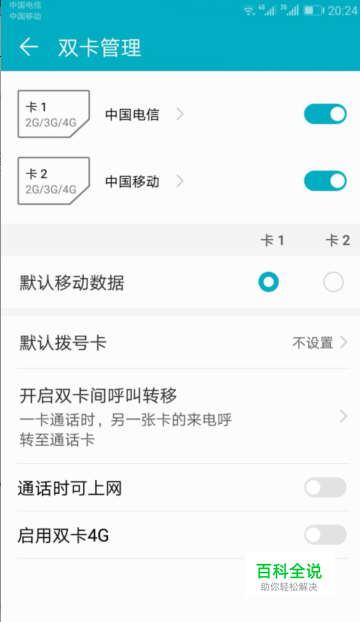 点击双卡管理后,弹出下面的页面,发现启用双卡4G的对话框的状态栏是灰色的,还没有启动。