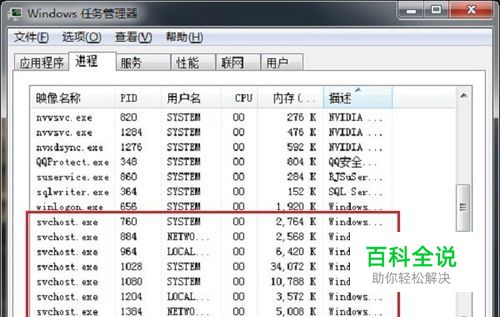 第二步进去任务管理器之后,可以看到很多进程,往下拉,可以看到很多“svchost.exe”进程,如下图所示: