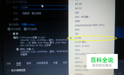 最后,我借助premiere视频导出界面。说下如何导出高质量和清晰画面的视频。看到编码格式那里,选择H.264,码率选“VBR(可变码率),1次”。目标码率:10Mbps,最大码率:30Mbps。帧速率:25帧/秒。场序:逐行,有个电视标准,我们就选PAL。勾选”使用最高渲染质量“。点”导出“即可。