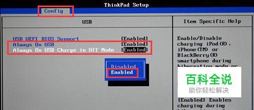 2、在bios界面中,移动光标选择config选项卡,在下方的列表中将“Always On USB”和“Always On USB Charge in Off Mode”调成Enabled,如图所示: