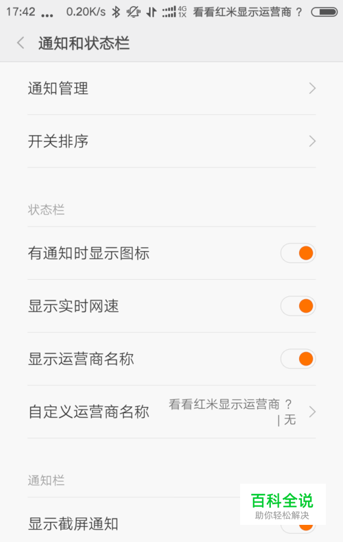 继续点开“通知和状态栏”,就能看见“自定义运营商名称”,因为是双卡手机,所以我的可以设置两个,但若你只插入一张电话卡,便只能跟我一样只显示插了卡的那一个(不管有没有自定义名称都不显示)