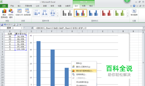 点击图表工具下的 设计— 选择数据,选中“系列1”,点击 编辑按钮,在系列名称下的文本框中输入“比例”,同样地将“系列2”改为“累计百分比”,按确定,可见图例名称已改变。