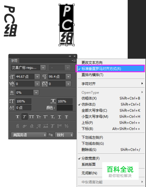 点击“字符面板”的右上角的“三角下拉”钮,选择“标准垂直罗马对齐方式”