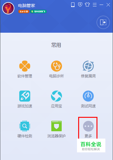首先,启动电脑管家,然后点击右下角的“工具箱”。