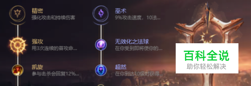 首先介绍狗头的符文天赋吧。带的是 精密的强攻、凯旋、血统以及致命一击,然后就是巫术系的无效化之法球、超然,护甲等,如图所示。