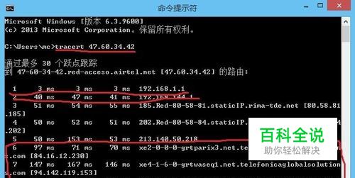 我们输入“tracert”加你要查的那个人的ip,想必大家一定看到了6,7,8行被小编圈起来了,6,7,8行显示的就是对方曾经上过的网站的ip