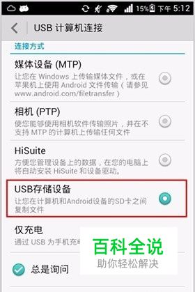 其实在微信里面是没有下载视频这个功能,但是我们播放视频的时候其实微信就已经帮我们下载好视频到手机里面了,所以我们要下载和朋友聊天时的视频的话就播放视频就OK了,注意:视频一定要播放完毕哦。然后用数据线把手机连接到电脑上,在手机里面选择“打开USB储存设备”。