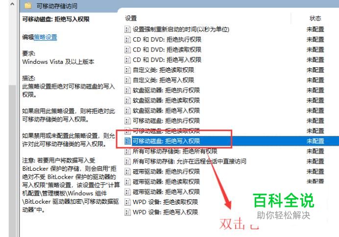 然后我们就会在右侧界面中看到可移动存储访问的一些配置项,我们需要找到可移动磁盘的拒绝写入权限,然后双击它,如下图所示