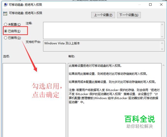 接下来在弹出的拒绝写入权限配置界面勾选已启用选择框,接着点击确定按钮,如下图所示