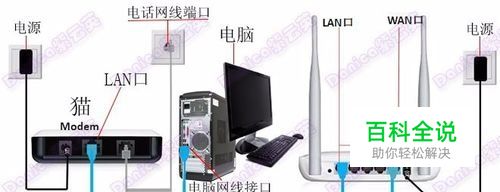 一、台式电脑线路操作(如图): 需要利用一条网线,首先一端连接调制解调器(即:modem宽带猫)上的LAN接口,另一端连接到无线路由上的WAN接口,然后再用一条网线,一端连接路由器LAN接口(即除了WAN的其他接口,比如1、2、3、4接口,任意接一个即可),网线另一端连接电脑的RJ45接口(即:网线接口)。