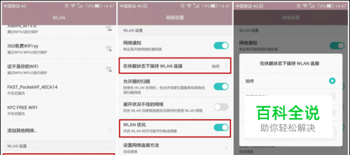 点击设置下的WLAN,点击右下角的提示进入高级选项,“在休眠状态下保持WLAN连接”我们勾选“始终”。这样在锁屏状态下依然能确保wifi能保持网络通畅。至于wlan优化大家可开可不开,权衡下电量决定,建议不开启。