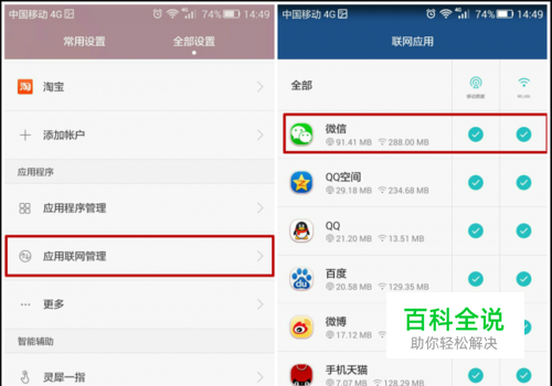 点击设置下的联网应用程序查看所有程序使用网络的权限状态,这里以微信举例那么我们要确保微信的移动数据和WLAN 全都处于可用状态,这里我们可以看到华为系统在一些细节问题处理的态度,虽然繁琐但是却给予了用户充分的自我设定空间。