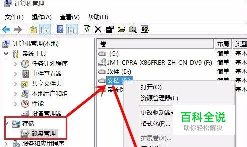 打开“管理”界面后,点击存储的“磁盘管理”,接着在右侧窗口找到无法格式化的磁盘,右击,选择“删除卷”
