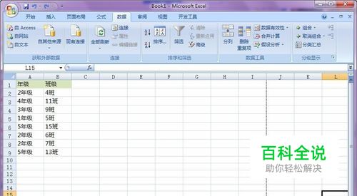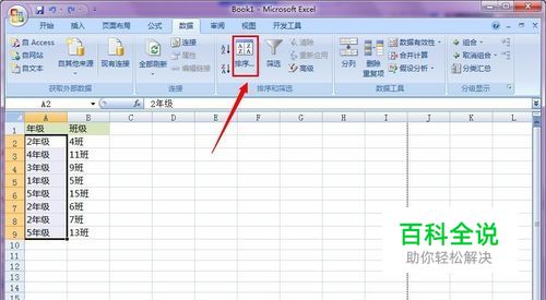 可以看到表格中的数据很杂乱,首先要把相同年级的数据行挨着排在一起。选中要排序的数据,点开“数据”选排序,如下图所示。