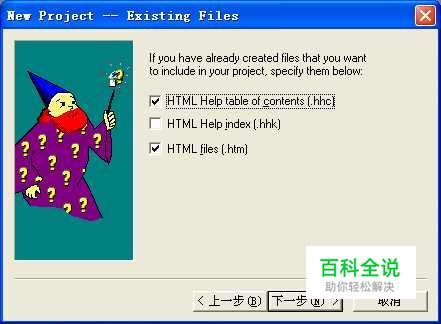 接下来选择该帮助文件需要哪些素材。其中 HTML Files(网页文件)这一项必选。如果你希望给帮助文件建立一个目录表,那么可以选中 HTML Help table of contents(目录表)这一项。