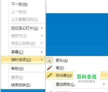 1、在ghost xp系统中打开PowerPoint2010,点击放映,单击鼠标右键,在打开的快捷菜单中选择“指针选项”命令,选择“圆珠笔”/“荧光笔”。