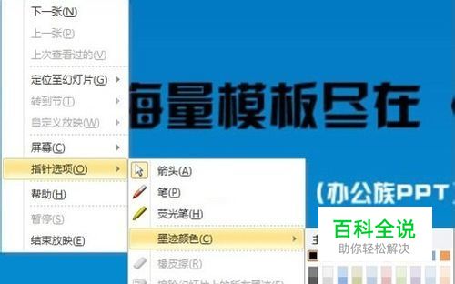 2、如果你对图笔的颜色不感兴趣,还可在右击幻灯片时弹出的快捷菜单中选择“指针选项”命令,再选择“墨迹颜色”,选择你喜欢的颜色。