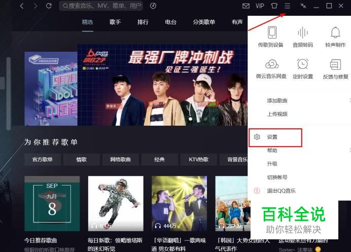 打开QQ音乐,点击右上角的三道杠图标,点击设置选项。