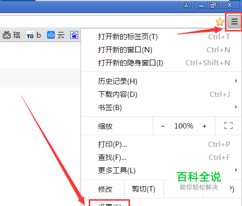 这时候再打开chrome浏览器,点击右上角的设置按钮,在弹出的菜单中选择设置。