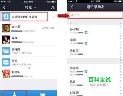 2. 从通讯录好友、或“转到支付宝账号”查找你要转账的人