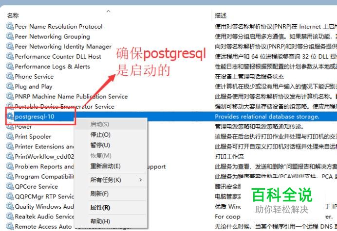 首先设置之前我们需要打开服务列表界面,确保postgresql的服务是开启的,如下图所示