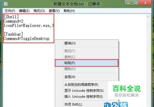 然后将这段代码复制到记事本中。 [Shell] Command=2 IconFile=Explorer.exe,3 [Taskbar] Command=ToggleDesktop