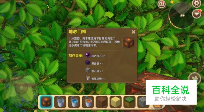 地心门框是由远古宝石、黑晶石、岩石块和岩浆铁桶这四种物品制作而成的,因此我们需要分别获取这四种物品。