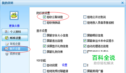 然后在呱呱设置→聊天设置选项卡中,勾选右侧的拒收公聊消息选项,然后点击确定按钮即可,如图所示: