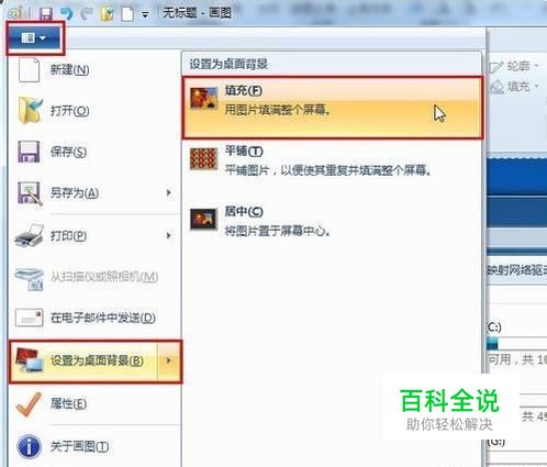 将这张屏幕截图保存到任意一个位置,然后点击画图工具左上角的蓝色按钮,选择下拉菜单中的“设置为桌面背景”,方式选择“填充”,将这张图片设置成Win7桌面背景。