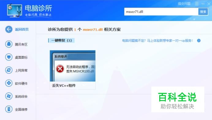 进入电脑诊所界面,在搜索框内输入 msvcr71.dll,如下图