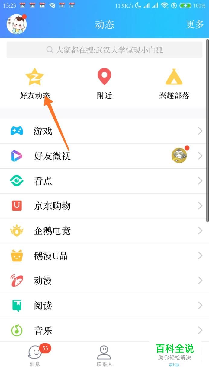 打开最新版的手机QQ,点击“动态”,然后点击“好友动态”。