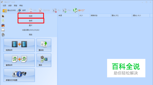 打开格式工厂。如果是音频,点击音频;如果是视频,点击视频。
