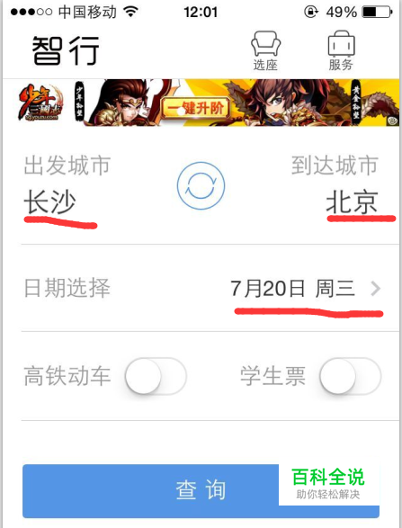首先打开你的购票软件,如下图所示 页面为例,我选择从长沙到北京的一次列车。大家可以看到我标示的站点及其时间,并点击搜索。
