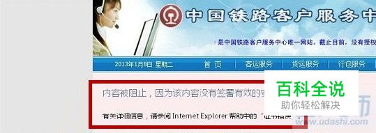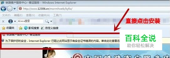 来源:U大师U盘装系统 不少初次登录12306网站购票的网友都遇到了这样一个问题“购票时出现了安全警告导致无法登录”针对此问题,小编与大家分享下解决办法。 问题分析: 一般来说,用户在电脑初次登录12306铁道部服务中心网站是需要安装铁道部服务中心网的安全根证书,一般第一次打开这个页面的时候浏览器时顶部会弹出提示,我们点击安装即可,但一些对电脑还不是很懂的朋友可能就没有在意,从而导致无法登陆铁道部客服中心购买火车票。 问题现象: 用户在点击客运服务后常出现IE浏览器报出的安全警告,“Internet Explore已阻止此网站显示有安全证书错误的内容”、“内容被阻止,因为该内容没有签署有效的安全证书”等。如下图: 解决方案: 1.在浏览器顶部出现提示的时候,点击运行安装,如下图: 2.下载后,直接安装,然后一直下一步即可完成安装,如下图: 3.弹出导入成功窗口后单击下方的确定即可,如下图:
