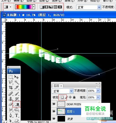 回图层1,锁定透明度像素。拉一个漂亮的彩虹渐变,OK。