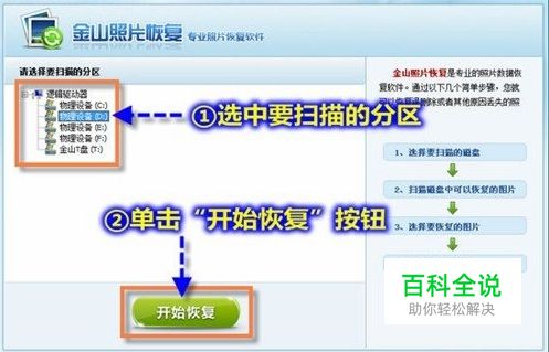 扫描可恢复的照片。启动金山照片恢复工具,弹出“金山照片恢复-毒霸会员专享”窗口,选择要扫描的分区,单击“开始恢复”按钮,系统开始对选定的分区进行扫描。
