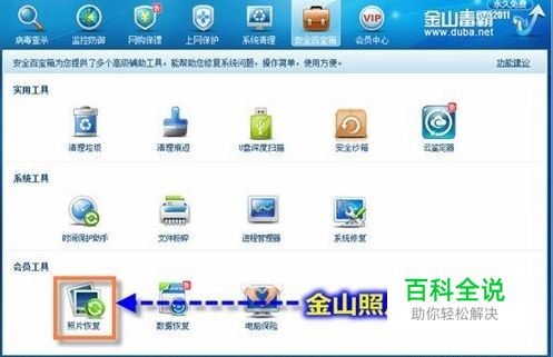 下载安装最新版的金山毒霸2011 SP7正式版,打开界面可以找到其中有一个照片恢复工具。在金山毒霸中,可以从多个入口启动照片恢复工具,单击“病毒查杀”窗口右侧“会员特权”栏下的“照片恢复”;单击“会员中心”窗口“安全特权”下的“照片恢复”;单击“安全百宝箱”窗口“会员工具”栏中的“照片恢复”都可以启动金山照片恢复工具。