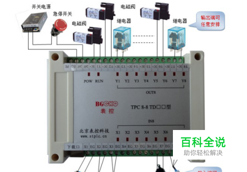 图中所示是使用表控TPC8-8TD型作为气缸控制的接线原理。输出端可以直接驱动24V电磁阀、继电器等负载。负载接于DC+与Y输出端之间,