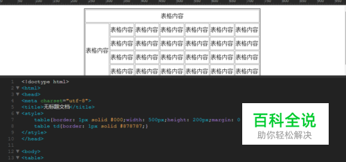 为了表格能够更加清楚地显示效果,我们需要给表格添加一些CSS效果。 <style> table{border: 1px solid #000;width: 500px;height: 200px;margin: 0 auto;} table td{border: 1px solid #878787;} </style>
