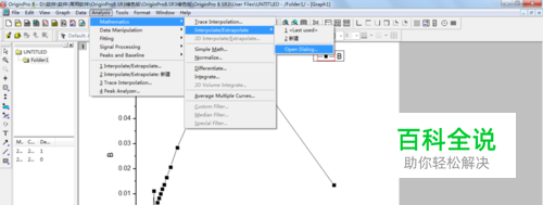 首先打开我们需要提取数据的图谱。点击菜单栏中“Analysis”下面的“mathematics”,在下拉菜单中点击“Interpolate/Extrapolate”,选择后面的Open Dialog。