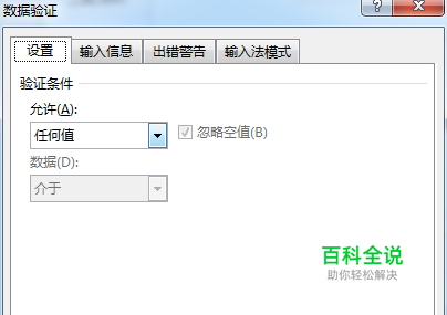 双击打开“数据验证”按钮后,弹出如下数据验证框,我们可以看到数据验证框内的内容。